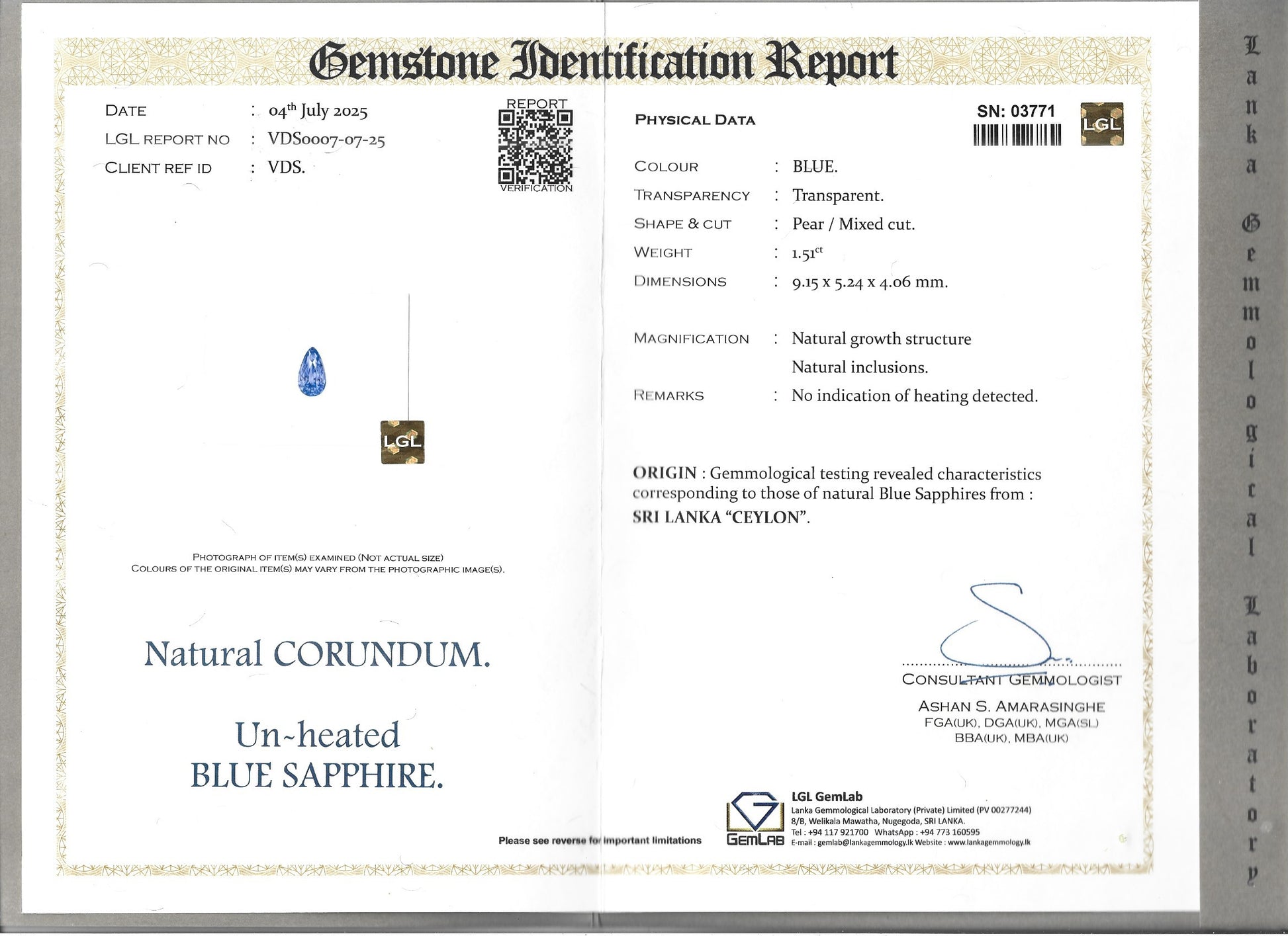 Ceylon Blue Sapphire. Pear Shape. 1.51 ct. Unheated.